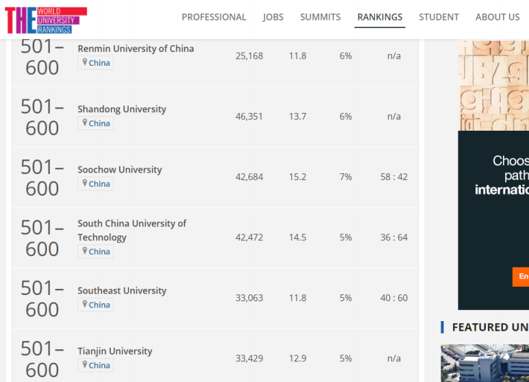 在UWS之后的有北京航空航天大学,湖南大学,人民大学,山东大学,中山大学,天津大学,西安交通大学等。