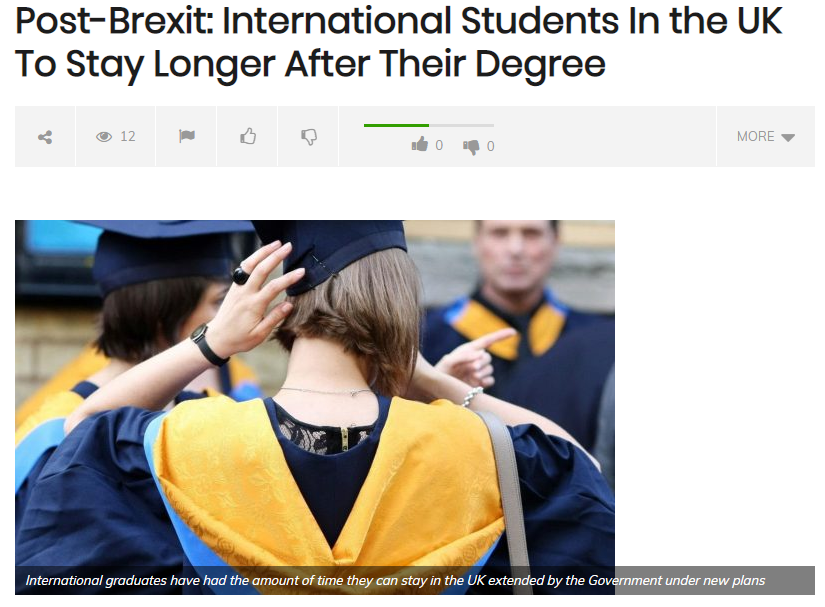 2018年12月,英国政府出台的移民政策提纲中建议脱欧后国际留学生毕业后的签证时间延长。