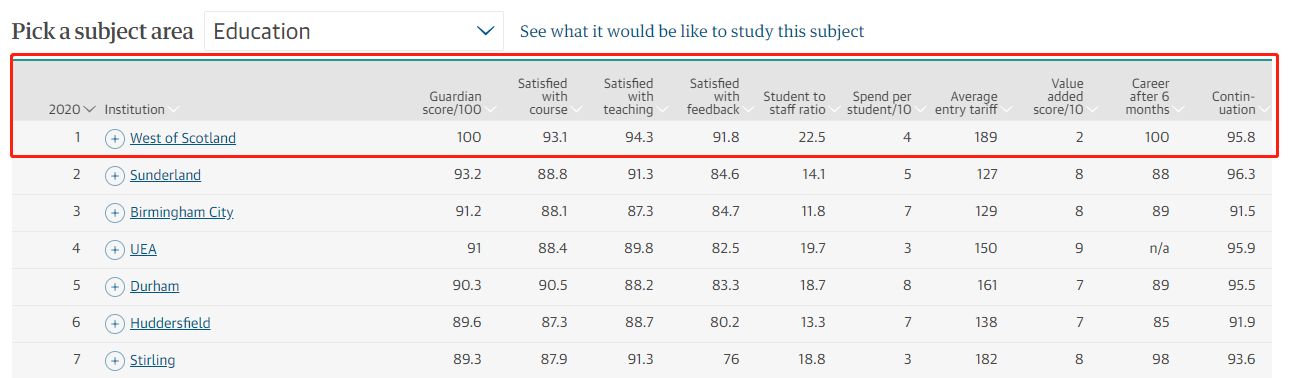 近期,《卫报》发布了2020年的英国大学排名榜单,排名涵盖了英国地区的121所大学院校,同时还对各学校的情况作出了评价。UWS教育专业排名在这121所大学院校中拔得头筹,喜获第一!