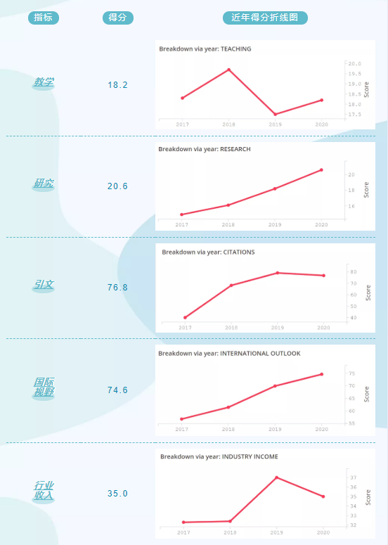 《泰晤士报高等教育年轻大学排名》的榜单,和世界大学排名的绩效评估指标是大致相同的,即对符合资格的院校在以下几个方面进行了评估: